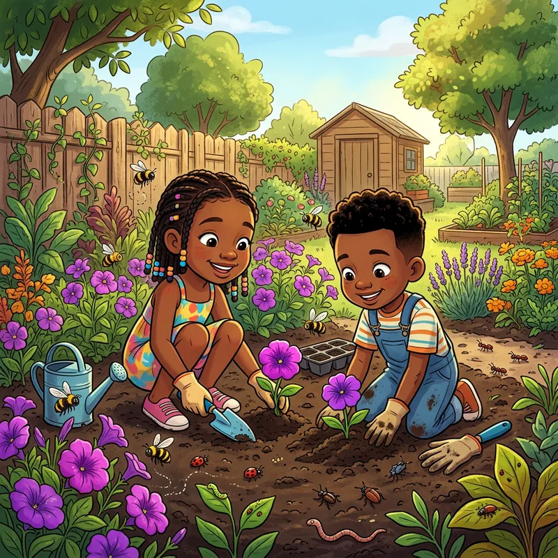 Animated image of a young black girl and black boy engaged in the activity of planting vibrant purple flowers in a garden setting. They are surrounded by bees buzzing and various tiny bugs scurrying around, contributing to the lively atmosphere of the natural environment.