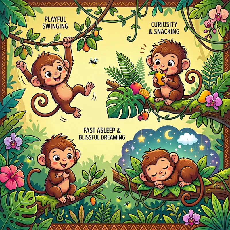 Vector illustration of a cute baby monkey depicted in three different poses. In the first pose, the monkey is playfully swinging from a tree branch, showing delight on its face. In the second pose, it's nibbling on a fruit, showcasing its curiosity. The third pose has the monkey fast asleep, dreaming blissfully. Each representation is filled with lively colors and charming details, perfectly capturing the delightful spirit of a monkey cub.