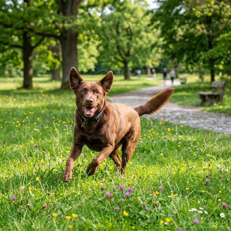 A scene of a serene park in which a playful, medium-sized dog with a shiny brown coat is frolicking around. The dog's tail is wagging excitedly, its furry ears perked up, its bright eyes reflecting the joy it is experiencing. Around it, the green grass is thriving, occasional colorful flowers dotting the landscape. The dog looks towards the viewer with a demeanor of friendly curiosity.