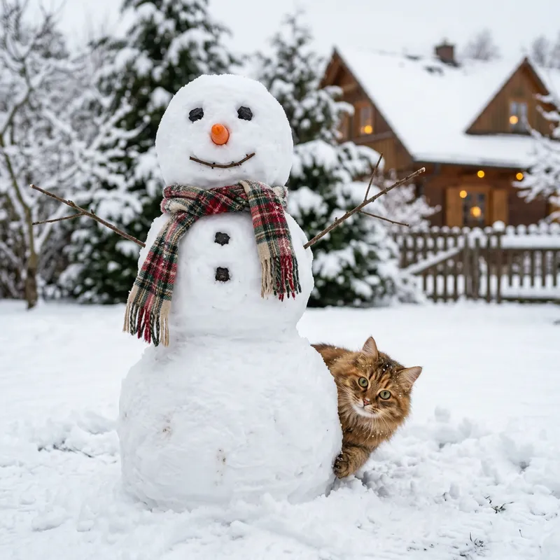 Playful Cat Sneaking Behind Snowman in Winter Scene