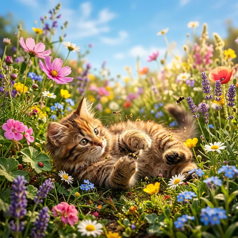 A playful domestic cat frolicking in a sunlit garden, filled with an array of lovely bloomed flowers of different colors and a clear blue sky. The scene is captured from a macro lens perspective, enhancing the intricate details of the cat's fur, the plant textures, and tiny insects buzzing around. The sun beams bathing the garden produce vibrant, rich colors that manifest in a whimsical, nature-inspired atmosphere.