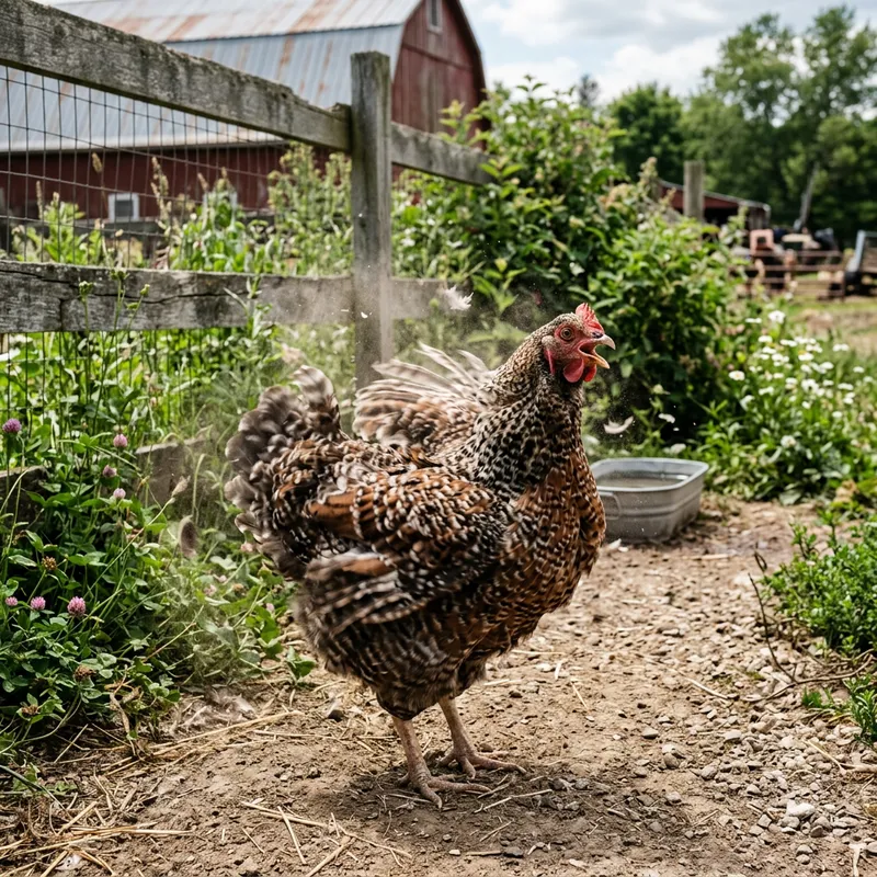 Playful Chicken Shaking Feathers in Farmyard Dance