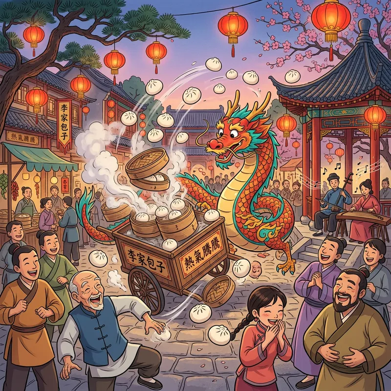 A humorous scene featuring an animated Chinese setting. The scene could include a traditional Chinese courtyard with red lanterns hanging from trees. A Chinese dragon, depicted in a playful manner, is accidentally causing mild chaos by knocking over a steam bun cart while trying to weave through the courtyard, with steam buns flying around amusingly. A group of people are looking surprised and laughing at the antics of the dragon. There is also background music playing traditional Chinese instruments like the Erhu and Guzheng for added flavor.