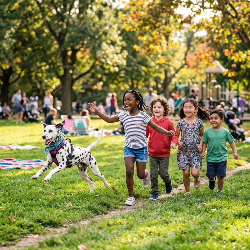 A playful female Dalmatian dog energetically running and playing with a group of diverse children in a lively park scene, the ambiance filled with bright and joyful colors capturing the energy and excitement of the moment. Enliven the scene with action shots of the dog leaping and bounding, emulating the quality of an outdoor portrait shot on a high-end DSLR camera. The scene should reflect a family-friendly outing, complete with the joyful expressions on the kids' faces and the animated movements of the playful dog.