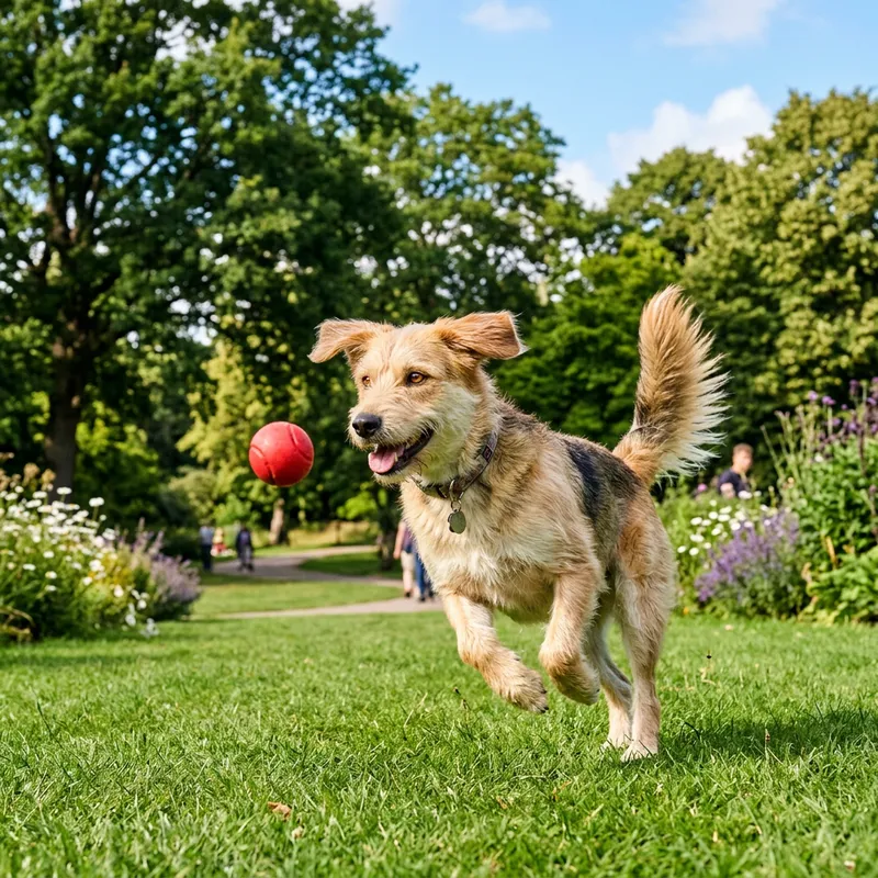 A playful, medium-sized dog of indeterminable breed cavorts in a lush, sunlit park. The dog's coat is a glossy blend of tawny and cream, peppered with darker patches that ripple as it moves. Its expressive eyes glint with excitement as it chases a bright red ball across the freshly mowed grass. The dog's ears flop joyously with each bound, and its wagging tail is a flag of happiness. The park around the dog is vibrant, filled with towering trees gently swaying in the soft breeze, blooming flowers dotting the landscape, and a clear sky overhead.