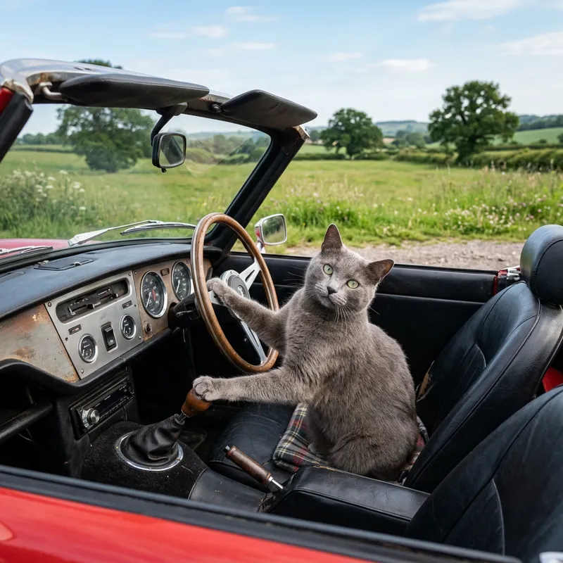 Create a playful and humorous scene showcasing a charming domestic cat with soft gray fur and captivating green eyes. The cat is amusingly staged in the driver's seat of a vintage red car, its paw nonchalantly resting on the steering wheel and the gear stick. The location provides contrast with its peaceful ambiance, showcasing an open green field and trees in the distance, all under a serene blue sky. Infuse the image with the characteristic curiosity and enchantment often associated with cats.