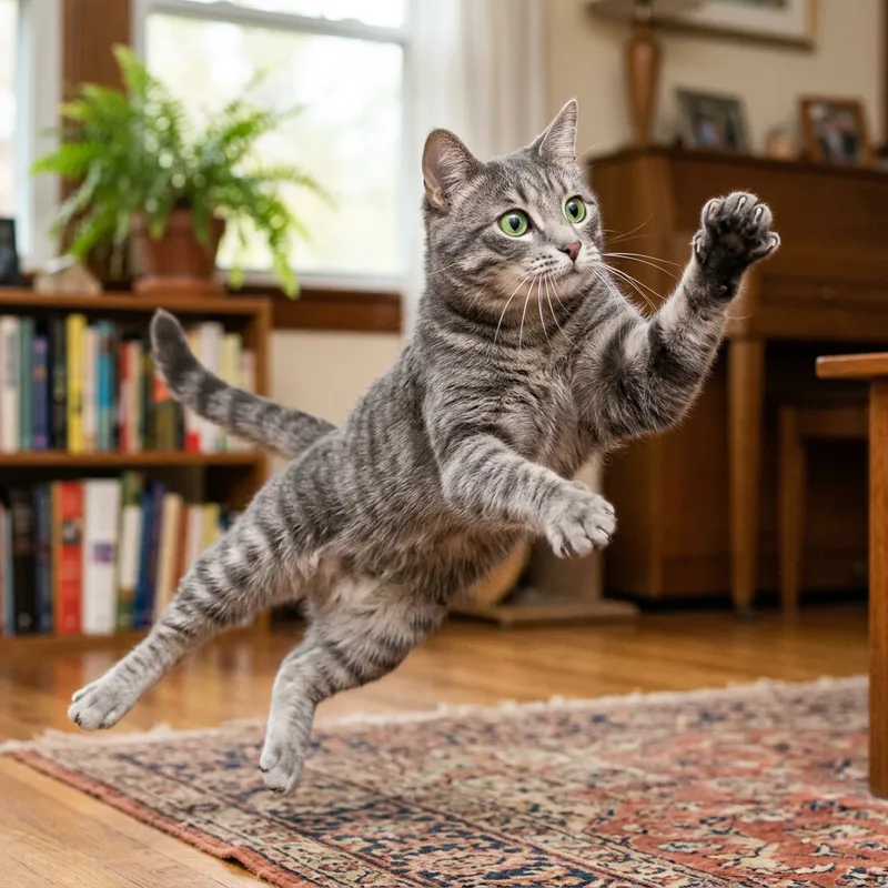 A charming gray tabby cat with soft, striped fur engaged in playful antics. It shows its vibrant green eyes and sharp but cute little claws. Its nimble body is twisting mid-air as it leaps energetically, attempting to catch an imaginary prey. Its ears are perked up and whiskers twitching, displaying an expression of sheer excitement and concentration. The scene is filled with the cat's energetic spirit.