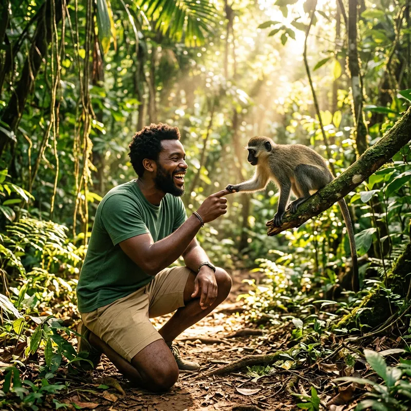 A monkey interacting with a Black man. The monkey has a lively and playful nature, showing signs of curiosity towards the man. The man, wearing casual attire, is delighted by the monkey's behavior, initiating a friendly interaction. They are both in a lush green forest, the sun bursting through the leaves reflecting a warm, yellow hue across the forest floor.