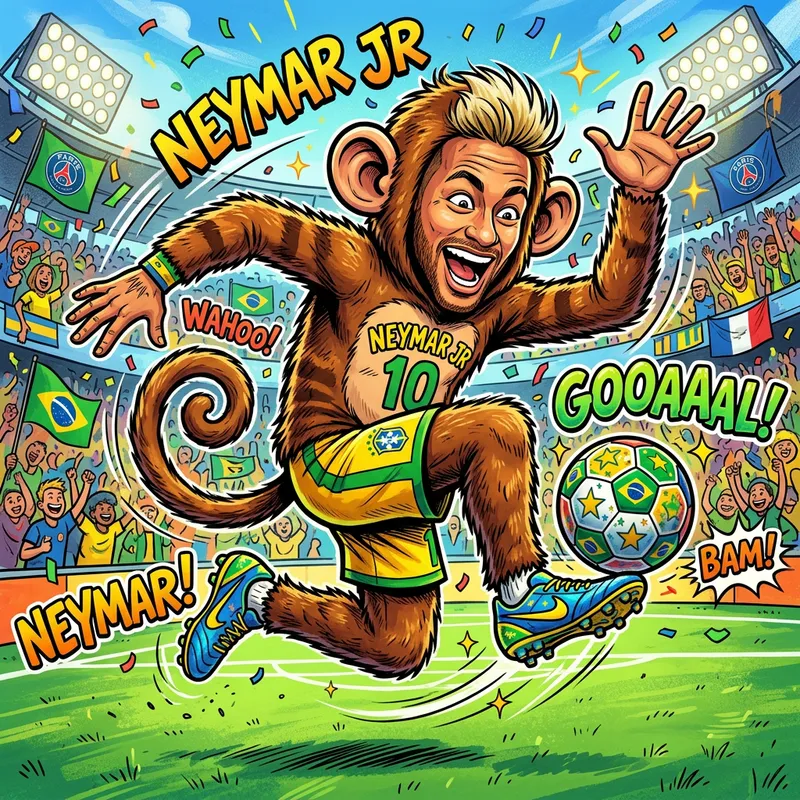 Neymar in a monkey costume, playful and whimsical, comic book style with vibrant colors, dynamic poses, exaggerated facial expressions, digital painting with bold outlines, cartoon-inspired