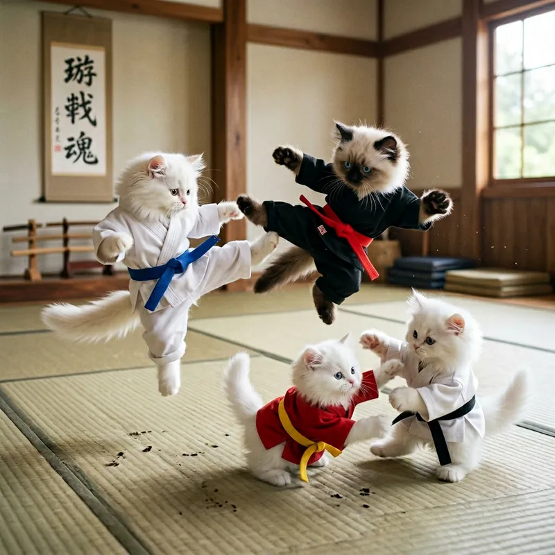 Create an image that realistically depicts two white Persian kittens and two Himalayan kittens each performing martial arts moves inspired by ninjas. They are playfully engaging with each other, spreading an aura of fun and lighthearted competitiveness. The fur of the Persian kittens is plush, with predominantly white hues, manifesting their breed features, and the Himalayan kittens hold their fur coats of mixed colors, all engrossed in their energetic play-fight session. The scene captures the innocent energy and natural agility of the kittens, reminding one of mini ninjas training.