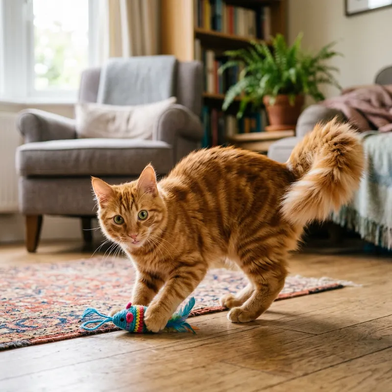 Playful orange tabby cat with green eyes and a fluffy tail.