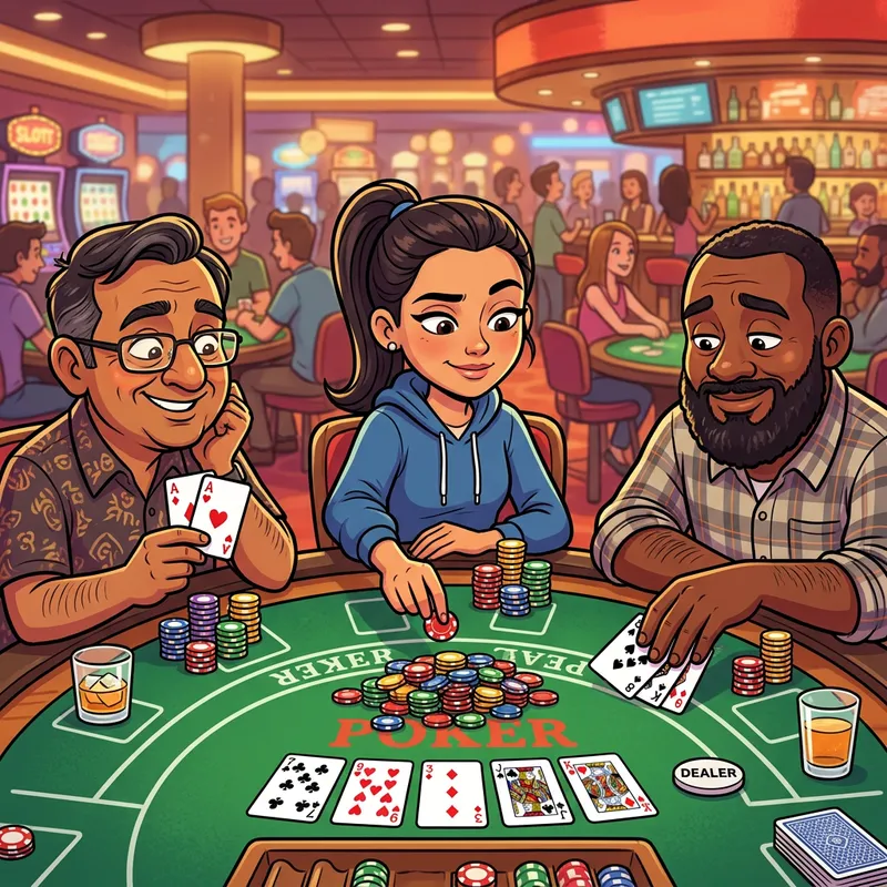 Create an image of three poker players sitting around a poker table. One player is a middle-aged South Asian man with spectacles; he has a playful glint in his eyes and holds two aces in his hands. The second player is a young Hispanic woman, with her hair tied up in a ponytail, contemplatively puts a chip into the pot. The third player, a middle-aged Black man with a beard, is folding his cards. All of this is drawn in a playful, vibrant, and cartoon-like style.