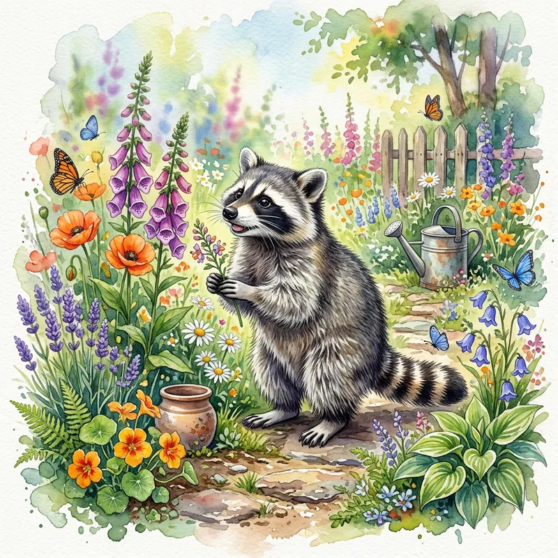playful raccoon exploring a garden, in the style of vibrant watercolor painting, capturing curious expressions, intricate details in fur textures, digital art with soft brushstrokes, whimsical nature scene.