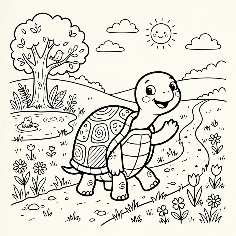Create an image in the style of traditional children's book artwork of a playful turtle. It should be a simple, uncolored cartoon design, an idyllic composition that would be appropriate for a 4-year-old child to color.