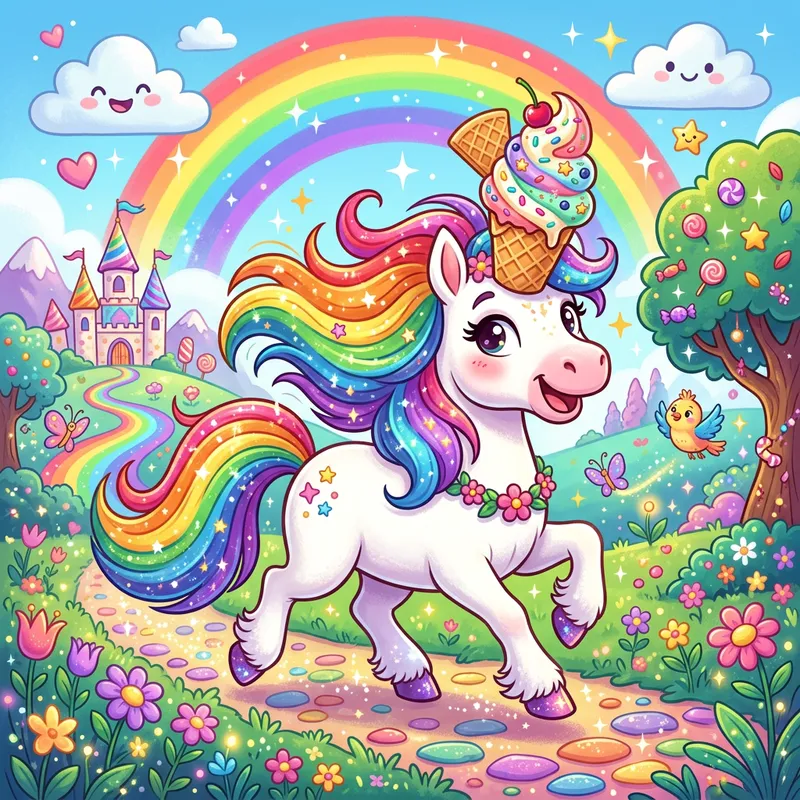 Create a cartoon-style picture of a white unicorn with an ice cream cone instead of a horn. The unicorn's tail and mane should be vibrant with the colors of the rainbow. The picture should be playful, invoking feelings of joy and imagination.