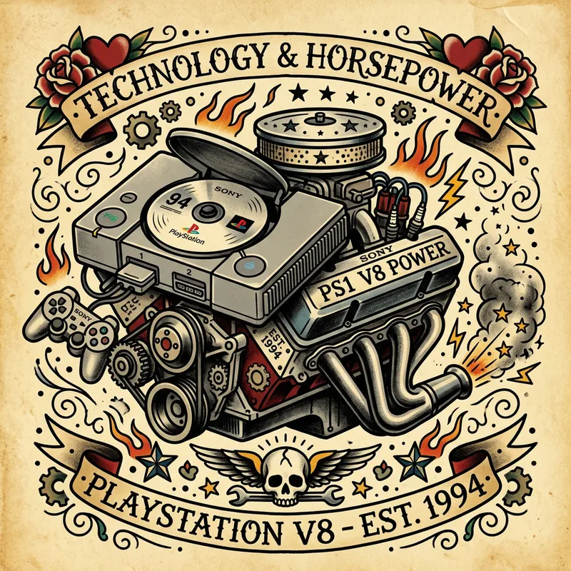 Imagine a unique combination of technology and horsepower: an early-era gaming console, the Playstation One, fused with a powerful V8 engine, both prevalent symbols of late 20th-century design. The elements are superimposed in the aesthetic of traditional old-school American tattoo art, characterized by bold black outlines, a limited color palette with a lot of black and little color, iconic motifs, and a sense of raw, hand-drawn creativity. Remember that this late 19th-century tattoo style often includes highlights such as banners, stars, and hearts for added personality.