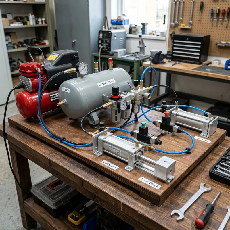 A detailed image of a pneumatic system. It consists of components such as compressor, air reservoir, pressure relief valve, pressure gauge and pneumatic cylinders connected by flexible tubes. The entire assembly is mounted on a solid platform for easy operation and flow control.