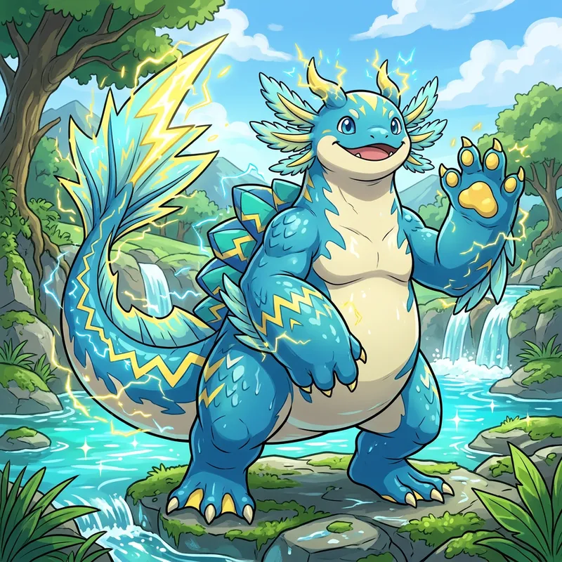An imaginary creature in the style of popular pocket monsters, referred to as 'Normand'. This creature exhibits a blend of unique characteristics. It should have a large physique, bright colors and a friendly demeanor. Perhaps it has an aquatic nature with scales or fins, or it could zig-zag like electricity around it -- the overall design is up to your imagination while keeping it within the norms of the pocket monster universe. Please avoid any direct resemblance to copyrighted characters.