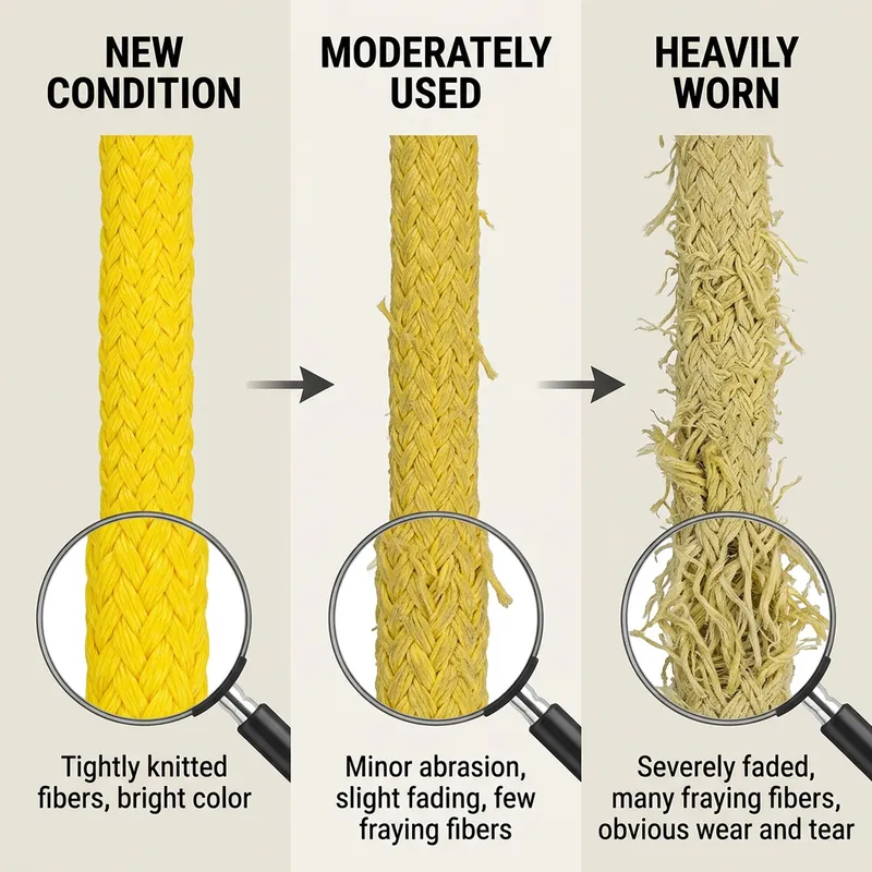 Create an educational image showcasing various stages of a polyester sling rope. Depict it in three stages: new, moderately used, and heavily worn. For the new condition, show a bright, solidly knitted rope with tight fibers. For moderate use, illustrate the rope with minor abrasion, slight color fading, and a few fraying fibers. For heavy usage, depict the rope severely faded, with many fraying fibers and obvious wear and tear. Use a magnifying glass inset to highlight changes in the fiber composition and structure at each stage.