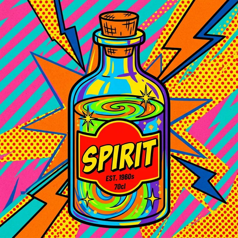 Depict a pop art style image of a spirit bottle. The bottle should be glass with a cork stopper, and contain a translucent, light-catching liquid that gives the impression of supernatural energy trapped inside. The bottle should be the centerpiece of the picture, with a bold, vibrant and striking color palette typical of the pop art movement. Use thick black lines to highlight its shape and to add a comic-like effect. The background should be a pattern of bright, contrasting colors to further emphasize the pop art style. Please, ensure the depicted bottle remains a generic spirit bottle, avoiding logos or labels that could infringe on copyright.