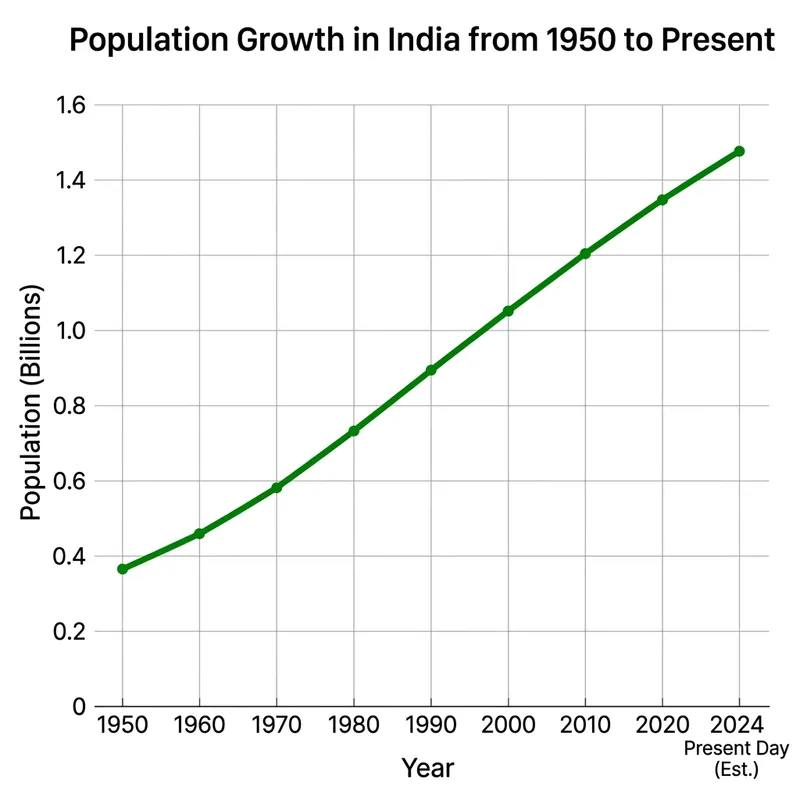 Create a statistical line graph illustrating the population growth in India from 1950 to the present day. Make sure to feature clearly labeled axes where the x-axis represents time in increments of ten years and the y-axis represents population in billions. The line should be green to represent growth, and the plot should have a descriptive title such as 'Population Growth in India from 1950 to Present'.