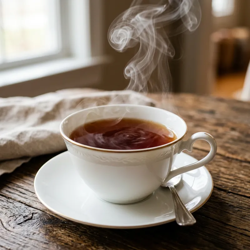 Visualize a porcelain white tea cup with a delicate curved handle, sitting on a matching saucer. A swirling mist of steam rises above the hot tea within, filled to the brim. The tea is dark amber in color, indicative of a strong brew. The entire scene is set against a rustic wooden table that accentuates the colors of the tea and the pristine whiteness of the cup.