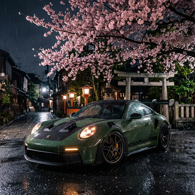 Porsche GT3 RS slightly tilted from the front with a sakura tree above, night scene with rain, minimal lighting, no rear lights on the car