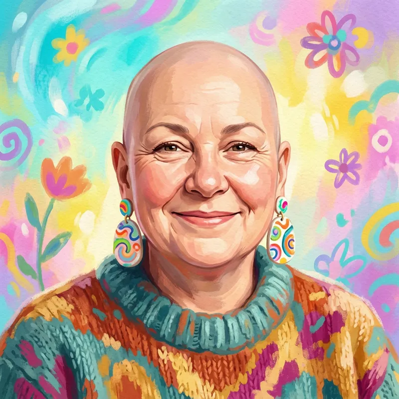 portrait of a middle-aged model with a bald head, showcasing a round face and soft features, painted in a whimsical style with bright colors, relaxed and cheerful expression, close-up view, vibrant digital painting, character study.