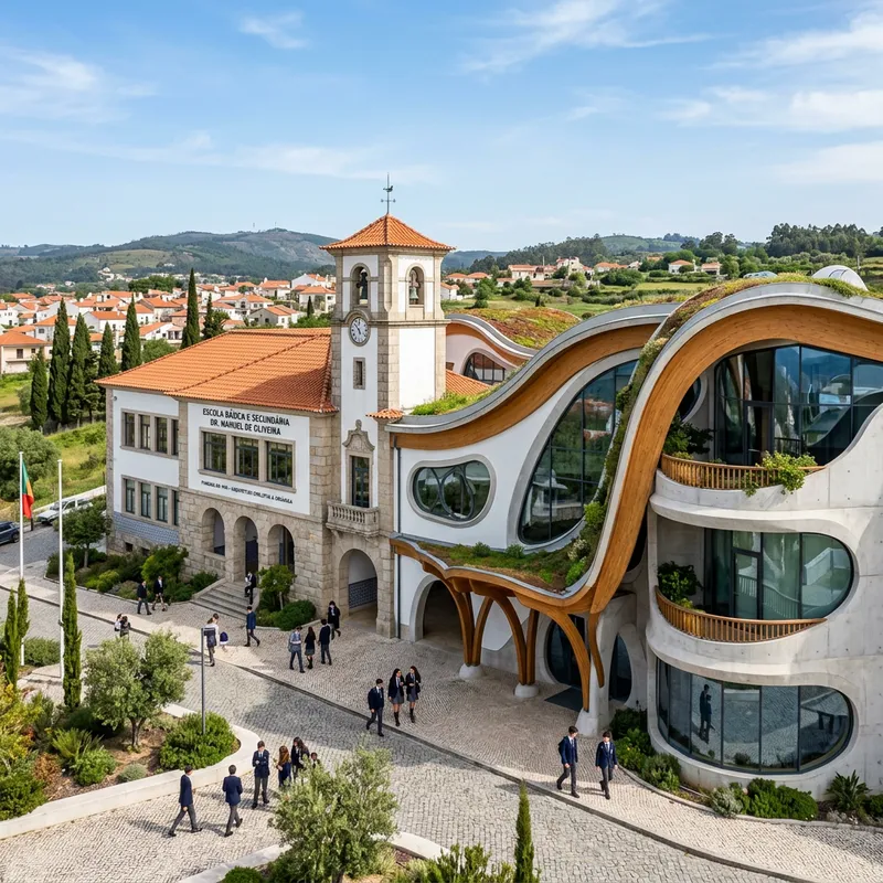 A school building located in Portugal with an architectural style reminiscent of the 1940s. The structure features characteristic elements from this epoch but has been infused with futuristic designs and organic architecture. You can notice elements such as rounded windows and walls, the use of natural materials, and designs inspired by natural shapes and forms. The building is noteworthy for its seamless blend of historical and futuristic architectural aesthetics.