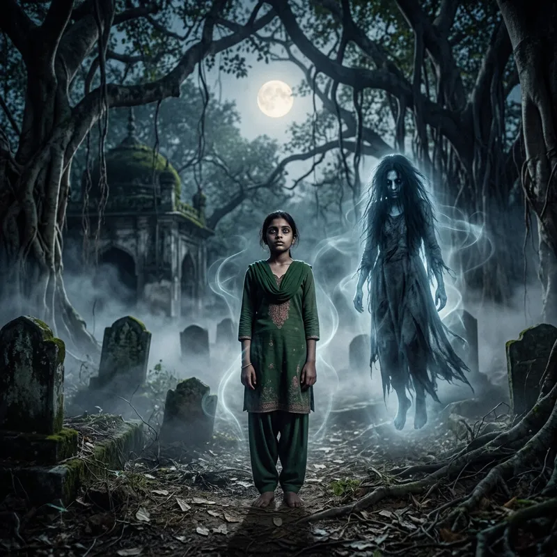A possessed girl of South Asian descent is standing in a spooky area, plagued by spirits. A distinct apparition of a frightening, spectral female figure hovers around her, enhancing the eerie atmosphere. The phantasmal aura is evident in the scene, suggesting lingering energies from beyond. The environment is filled with chilling air, unseen whispers, and ambiguous noises emanating from the shadows, serving as a hint to the spectral presence. Old, gnarled trees frame the scene and the moonlight casts an ethereal glow over the area. Additional elements like wispy fog and distant crumbling structures contribute to the haunted ambience.