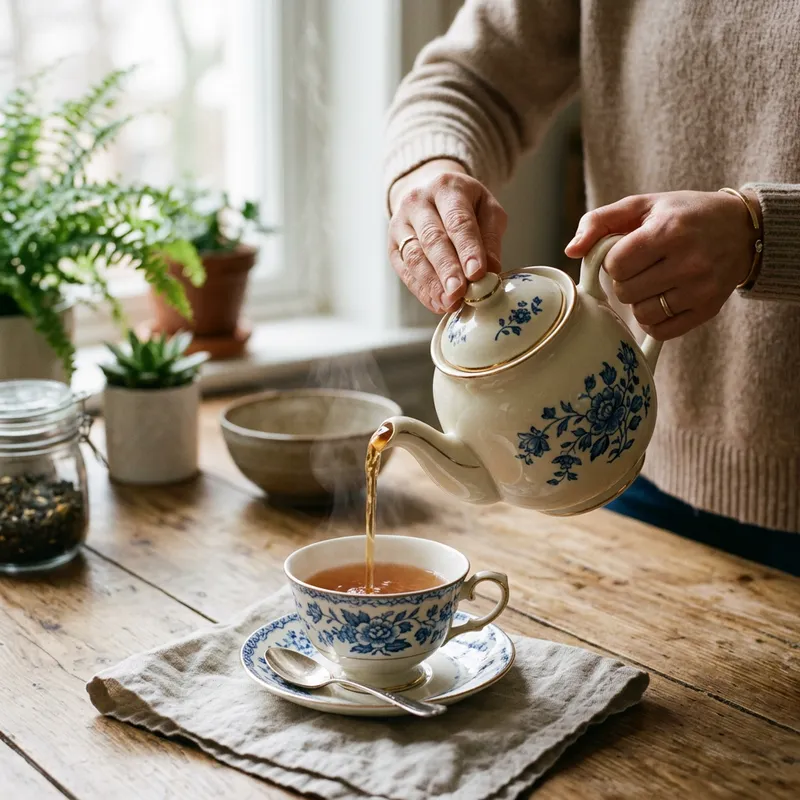 Original Prompt: Damskie dłonie nalewają herbatę do filiżanki.