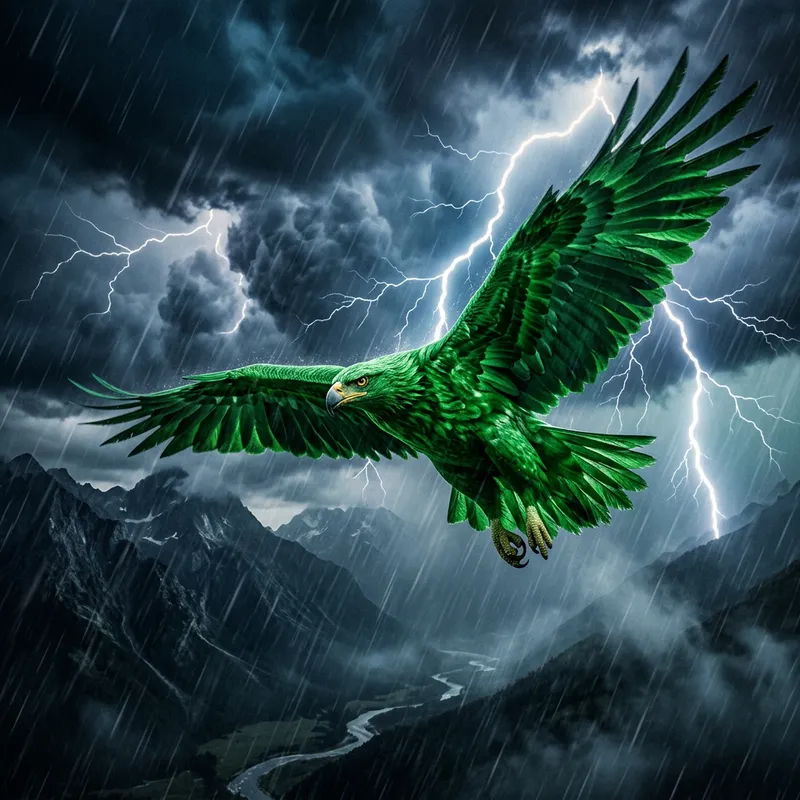 A powerful, muscular eagle, its feathers boasting a vibrant shade of green, in the middle of a dramatic thunderstorm. The storm clouds are dark, jagged, almost as if they're alive, with lightning streaking across the sky in electrifying arcs. Sheets of rain slash downward, cloaking the world beneath in an aquatic haze. Despite the disarray, the eagle remains composed -- wings spread wide, eyes sharp, capturing its image against the backdrop of nature's raw power.
