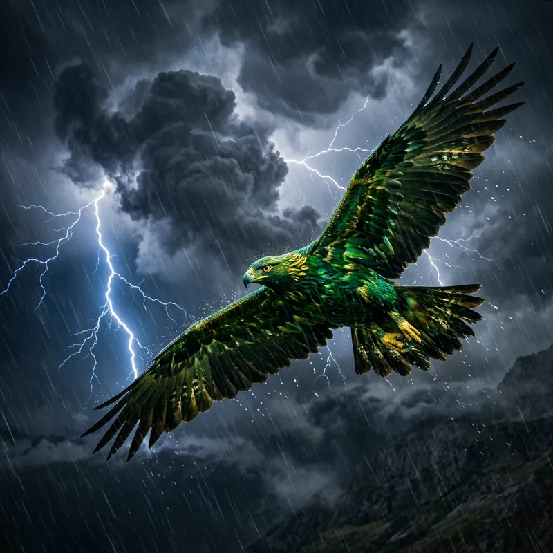 A powerful green eagle, its vibrant feathers catching the fierce winds, soars deftly through a brooding thunderstorm. Clouds darken the sky, illuminated occasionally by intense flashes of lightning that fork and crackle ominously, yet the eagle remains unfazed. Torrential rain pours from above, coating the eagle's feathers with a glossy sheen. There's even palpable electricity in the air, building suspense and lending an air of thrilling drama to the natural scene. Despite the treacherous weather, the eagle's firm gaze conveys confidence and resilience as it navigates the tumultuous sky.