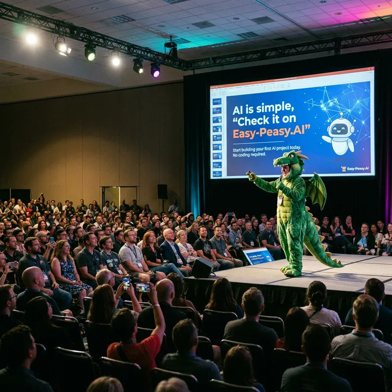 Powerpoint presentation, the slide title says “AI is simple, “Check it on Easy-Peasy.AI”, presenter is in a dragon suit, big audience