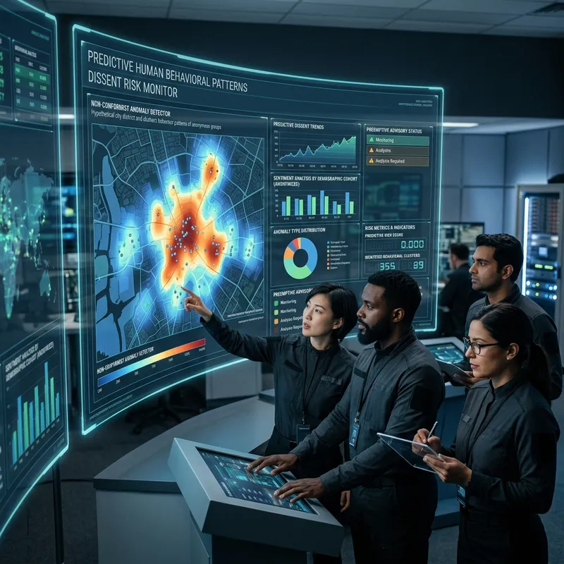 A sophisticated dashboard showing various data analytics, predictive algorithms, and visualization tools. The system is designed to predict human behavior patterns, presenting a heat map of diverse individuals with potential non-conformist behavior. Various charts and metrics on the screen display the predictive intelligence that may flag potential dissenters in a hypothetical society, potentially advising authorities for preemptive measures. The setting is a high tech monitoring room, with futuristic holographic screens and a panel of professionals, from various ethnic backgrounds and genders, analysing the data.