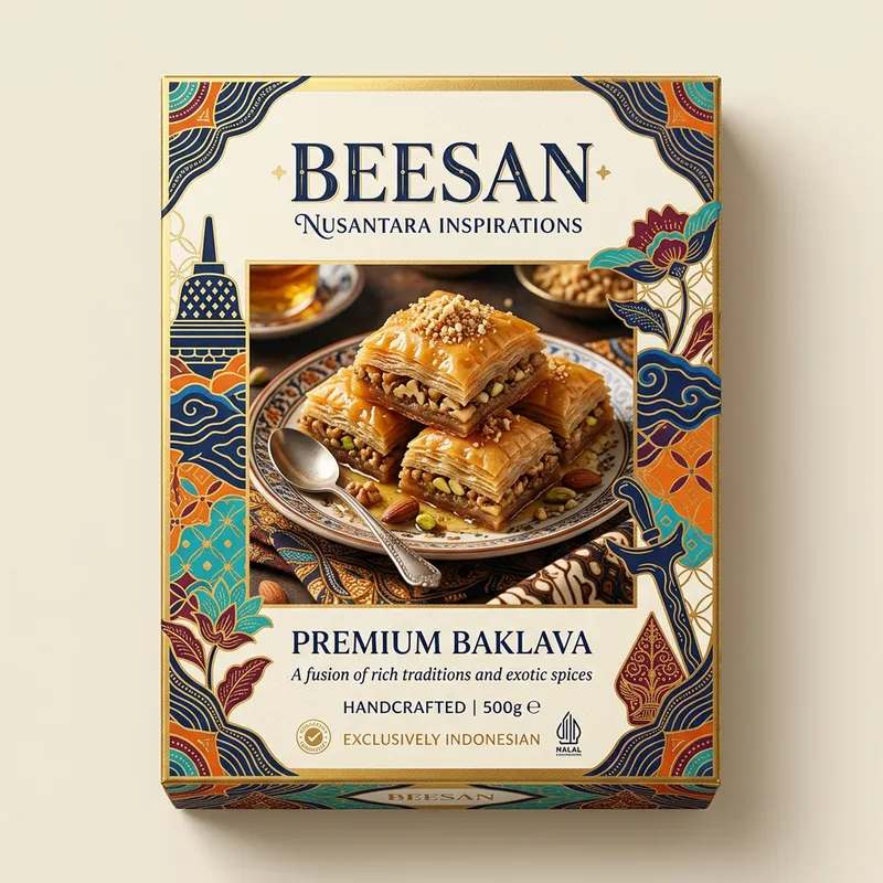 Create an enticing 16 cm by 23 cm packaging design for baklava. The design should draw inspiration from Indonesia's diverse heritage, incorporating vibrant colors, traditional patterns and cultural motifs. Implement a contour drawing technique for intricate details; utilize a bold, harmonious color palette filled with warm, inviting colors. Include a food photo element showcasing mouth-watering baklava layers. Convey the premium and exclusive nature of the product through a sense of opulence in the design. Incorporate branding elements such as 'BEESAN' and 'Nusantara Inspirations' in an elegant navy font, ensuring it aligns with the cultural theme. Plan for ample negative space, enhancing visual appeal and balance.