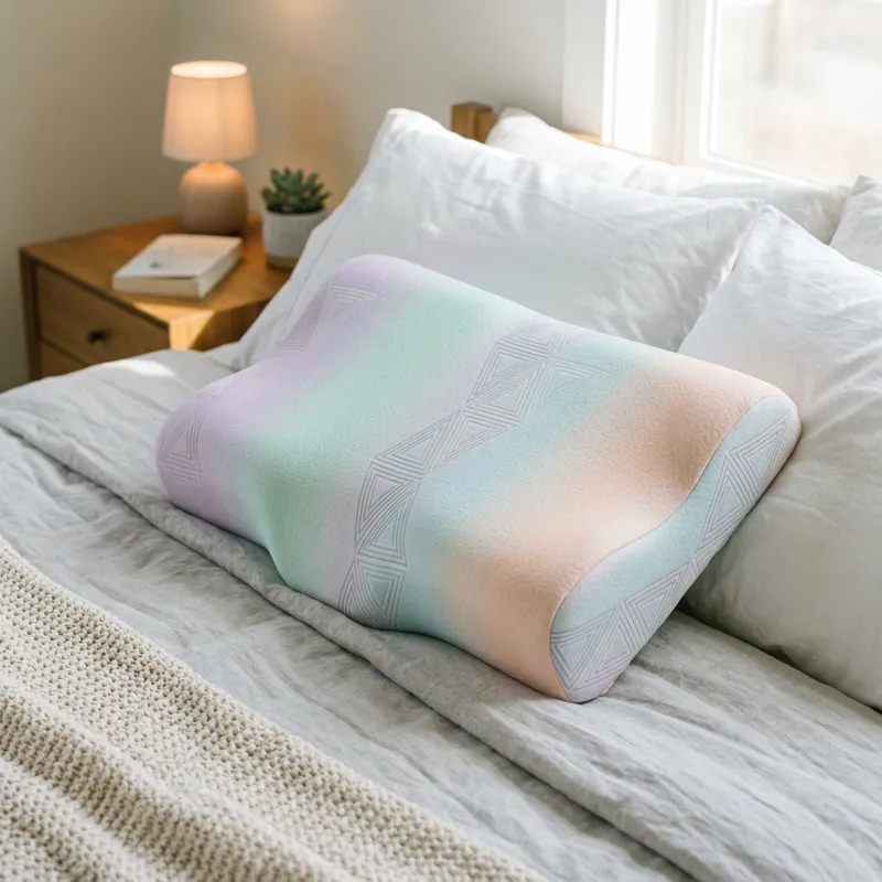 A newly trending pillow design specifically intended for relaxation use on a bed. The pillow is fashioned in pastel colors, radiating calmness, with memory foam filling for utmost comfort. Its ergonomic design contours perfectly to the shape of a person's head, supporting the neck, and aligning the spine. The fabric of the pillow has a cool-to-touch surface and features a minimalist, geometric pattern.