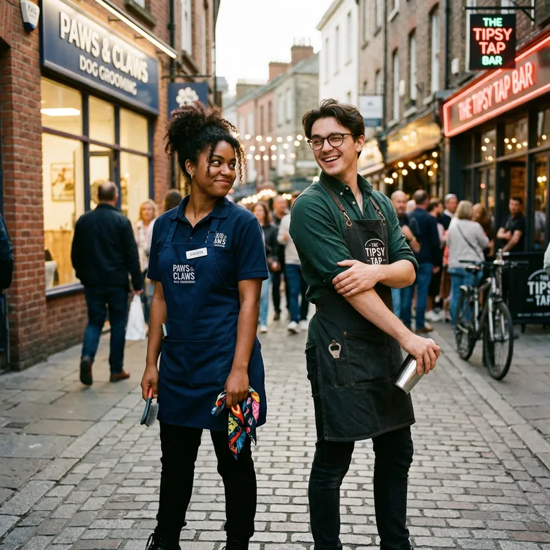 presents two main characters: Calista, 20 years old, with dark skin and curly hair wearing her dog grooming uniform, and Valentin, 22 years old, a bartender (light skin) wearing glasses. He has a playful expression on his face. They are facing away from each other as if they are enemies, but in a fun version.