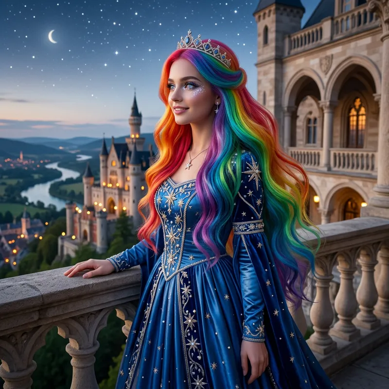 Create an image of a princess named Arella. She is known for her striking rainbow-colored hair that cascades down her back, resembling a vibrant waterfall. Her eyes are as glittering as the starlit night sky, bringing an ethereal charm to her royal demeanor.