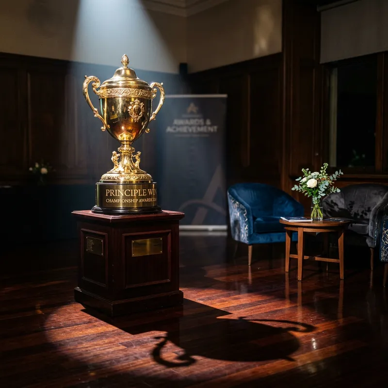 A large golden trophy with the words 'Principle Win' engraved on it, situated on a pedestal. The trophy is gleaming under a spotlight in an otherwise dim room. The spotlight casts a long shadow of the trophy on the polished floor. The room is filled with the anticipation of celebration, signifying an important victory or achievement. Minimalist decor surrounds the room, with a few comfortable chairs and a small round table with a vase of fresh flowers.