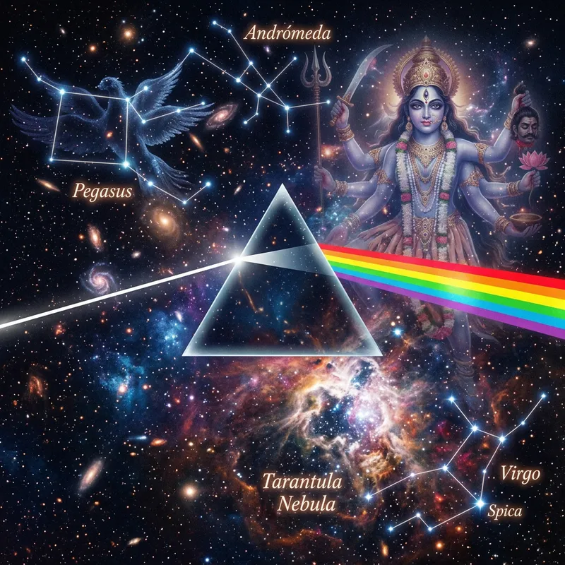 Create an image reminiscent of a famous album cover, where light refracts from a prism. The background should not be black, but rather provides a universe scene showing four constellations, specifically Andrómeda, Pegasus, Tarantula Nebula, and Virgo. In addition, include a gently faded image of a deity associated with creation, preservation and destruction, known for her multiple arms and the third eye.