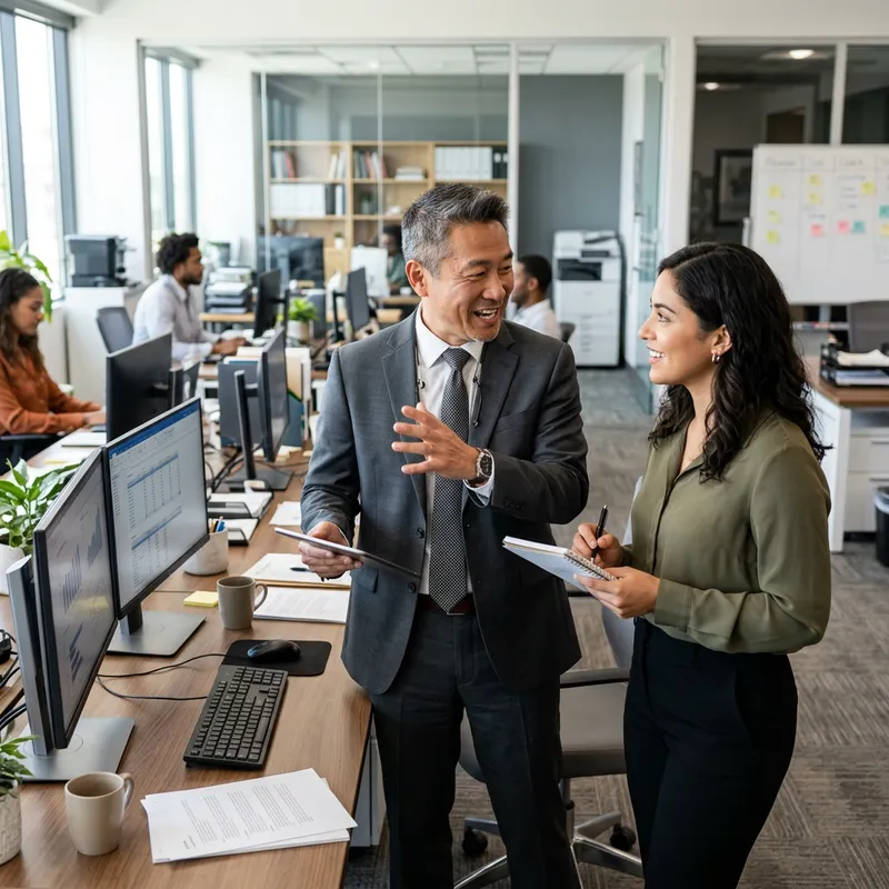 Photograph of a middle-aged man of Asian descent, dressed professionally in a suit, coaching a young Hispanic female employee, who is styled in business casual wear. They are in a modern office environment, the man is gesturing enthusiastically with his hands, illustrating a point, while the woman looks on, her face reflecting keen interest, holding a notepad and a pen. The background details include office equipment like computers, desks, and filing cabinets.
