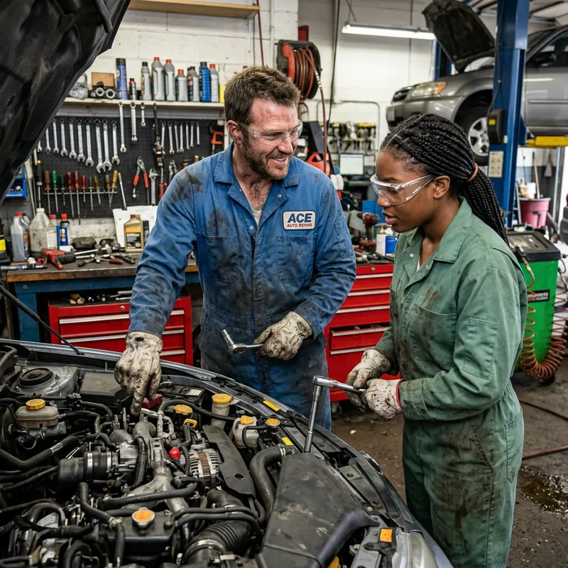 Professional Auto Repair Workshop: Male Mechanic & Female Apprentice