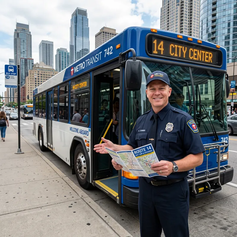 A professional Caucasian male bus driver in uniform is standing next to a large city bus. He is holding a route map and is ready to welcome passengers. Behind him, we can see a cityscape with high-rise buildings during the daytime.