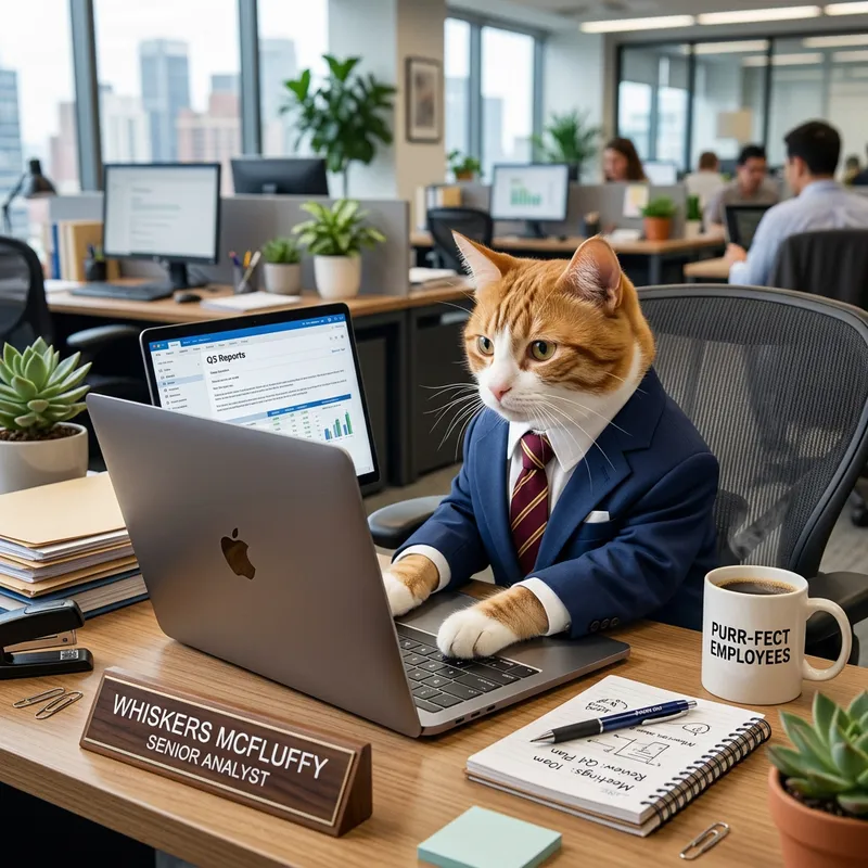 A professional cat sitting behind an office desk, fully engrossed in working on a laptop. The cat has a unique combination of a suit and tie, akin to any business professional in a corporate setup. The cat's eyes are concentrated on the laptop screen, paws gently resting on the keyboard as though expertly typing an email or managing other crucial work documents. The surrounding area is organized with office supplies like notepads, pens, and a coffee mug, hinting at a professional working environment.