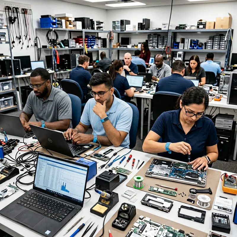 A busy service center filled with computer technicians of diverse descents and genders. To create a balanced representation, there will be a Hispanic female technician carefully repairing a high-tech laptop on a tidy workspace to her right while a Black male technician fixes another laptop at another desk to her left. Another South Asian male technician is examining diagnostic results on his own laptop, looking thoughtful. The scene is replete with peripheral computer parts, miniature screwdrivers, solder wires, circuit boards, all lending an intense atmosphere of serious technological repair work.