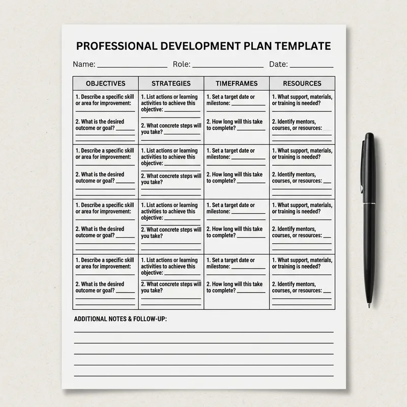 An image of a professional development plan template. The template is sharply delineated and clearly legible. It includes sections for objectives, strategies, timeframes, and resources. Each section includes a placeholder for written inputs and suggestions. The background is a softly-textured neutral color and the text color is dark black for easy reading. Also, the design is minimalistic and efficient, allowing user-friendly interaction.