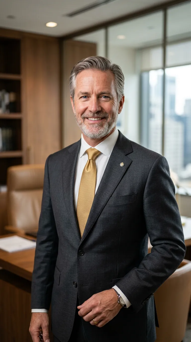 Professional headshot of a distinguished 55-year-old male partner in a premium wealth management firm. Wearing a tailored charcoal gray suit with a subtle gold tie. Blurred luxury office background. Confident, warm, and trustworthy expression. Photorealistic, 8k.