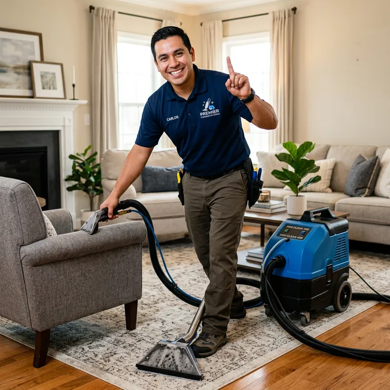 An image of a professional carpet and furniture cleaner at work inside a home. The cleaner, a Hispanic male, is wearing a uniform and a bright smile. He is using cleaning equipment to polish a carpet and a piece of furniture, and at the same time raising his index finger in a gesture indicating 'number one' or 'excellent'. Around him, the room appears neat and tidy, reflecting his efficiency and dedication to his profession.