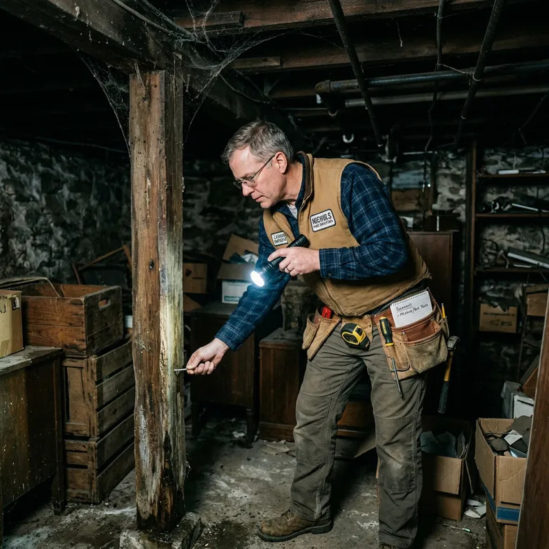 A Caucasian male home inspector in his early 50s, with greyish hair and wearing spectacles. He is checking the basement of an old house, using a flashlight. He has a tool belt around his waist, containing various instruments, like a screwdriver, a level, and a notepad. The ambiance of the basement is of dampness and darkness, with stacks of wooden crates and old furniture. Cobwebs hang from the ceiling, indicating neglect and lack of maintenance. The inspector is focused on his work, showing a professional and alert expression on his face.